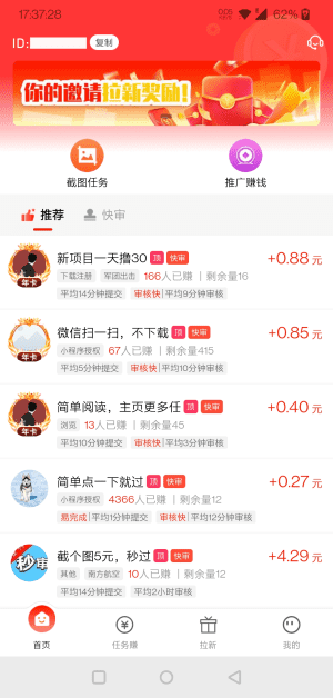 平台推出高激励邀请机制,支持多级分佣,最高累计提成可达14%。每成功邀请一位好友,不仅可获直推奖励,其后续任务收益你也能持续分成,邀请越多,收益越稳定,实现“躺赚”可能。
