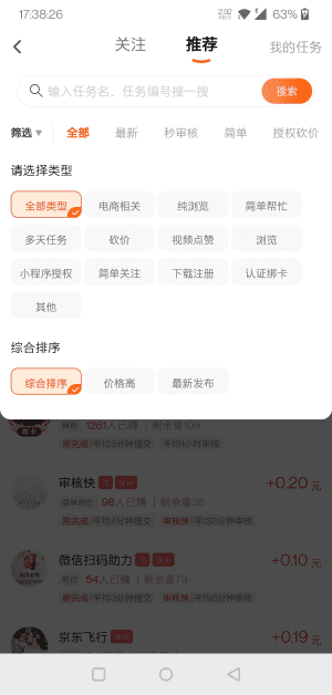 APP免费下载安装,任务池实时更新,设有“推荐专区”与“快审通道”,提升接单效率。点击底部“任务赚”,在右上角可按任务类型筛选,亦支持关键词搜索,快速锁定高性价比任务,省时又省力。